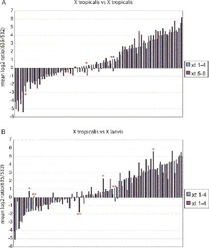 Fig. 3. Comparison of the results for each gene using X. laevis and X. tropicalis RNA. (A) The mean result for each gene is shown for two sets of 4 X. tropicalis experiments. (B) Shows the comparison of 4 X. laevis and 4 X. tropicalis experiments. The genes that are significantly different between the two sets are marked with ** (P<0.05) and * (P<0.1).