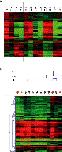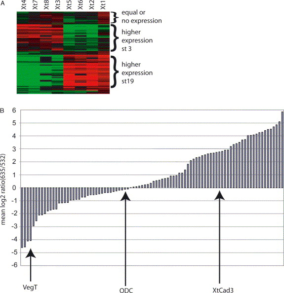 Fig. 1. A pilot microarray identifies genes whose expression changes during early X. tropicalis development. The microarrays were probed with labelled (Cy3 or Cy5) cDNA from st3 (4 cell) and stage 19 (neurula) X. tropicalis embryos. The hybridisations were carried out 4 times with one combination of dyes and 4 times with the dyes swapped, giving eight hybridisations in total. Each hybridisation is a biological replicate. The arrays were then scanned and the log2 ratio of fluorescence calculated for each oligonucleotide. (A) Cluster analysis of eight hybridisations using X. tropicalis material. Each column represents the result from 1 hybridisation, each bar the results from one gene. The greater the intensity of colour the greater the difference in ratio of the two wavelengths. Genes that appear black are not expressed or are evenly expressed in the two stages. Clusters of genes with higher expression at st3, st19 or equal expression can be identified. (B) The mean of the log2 ratio of the two wavelengths is plotted for each gene. The genes show a gradual transition from highly expressed at stage 3 to highly expressed in stage 19. The position of 3 well known Xenopus genes is marked.