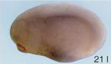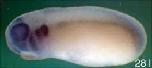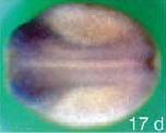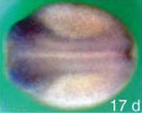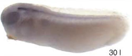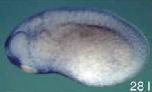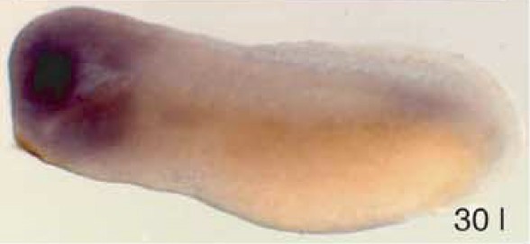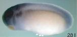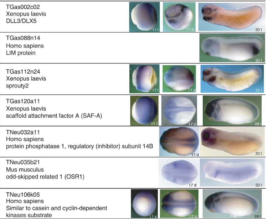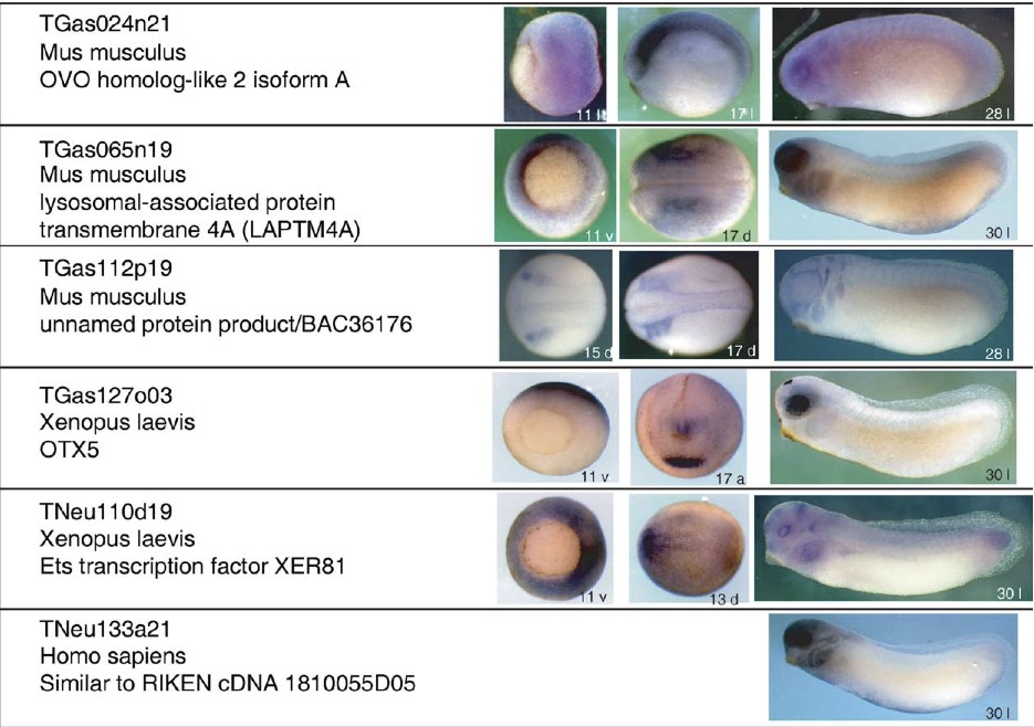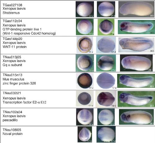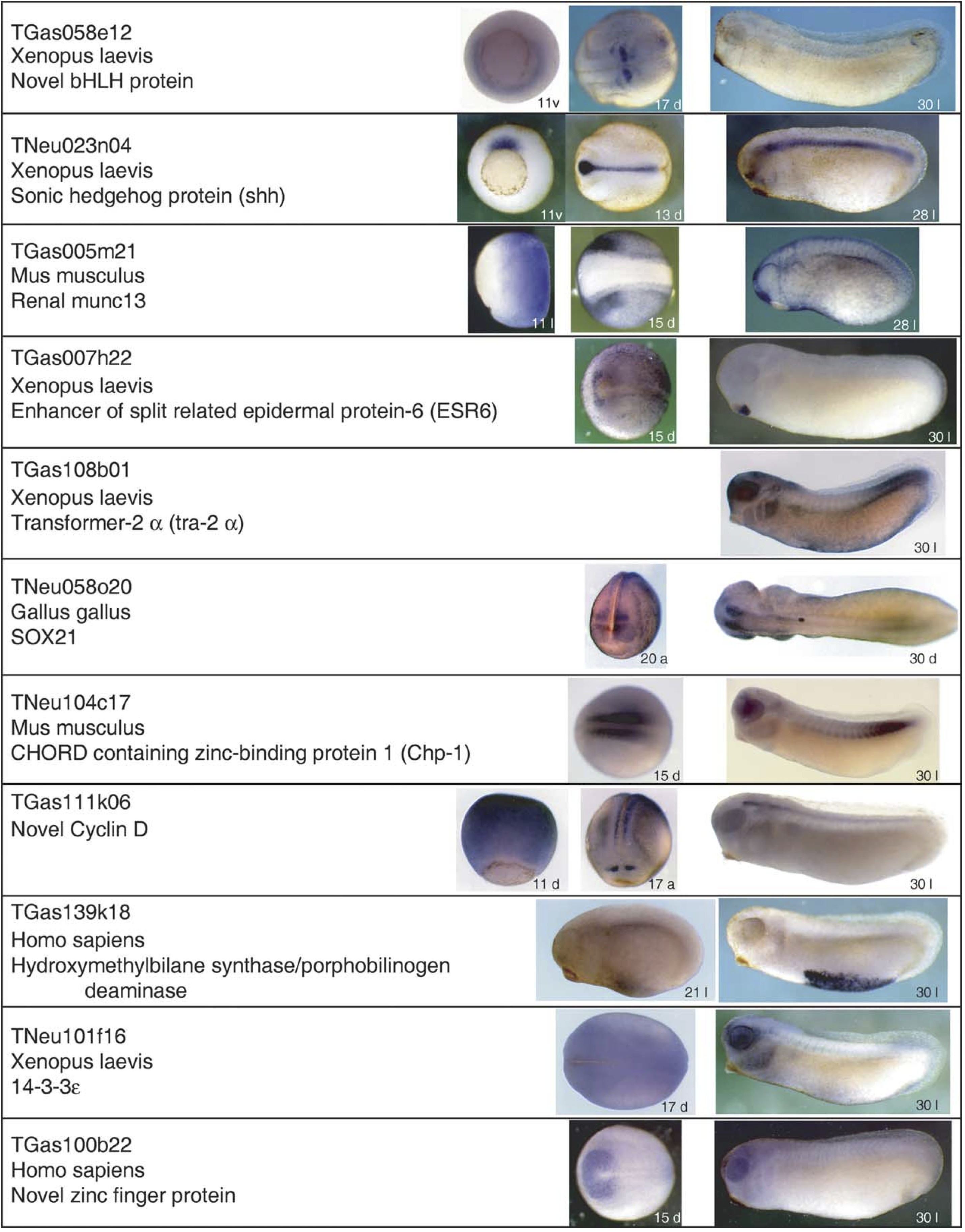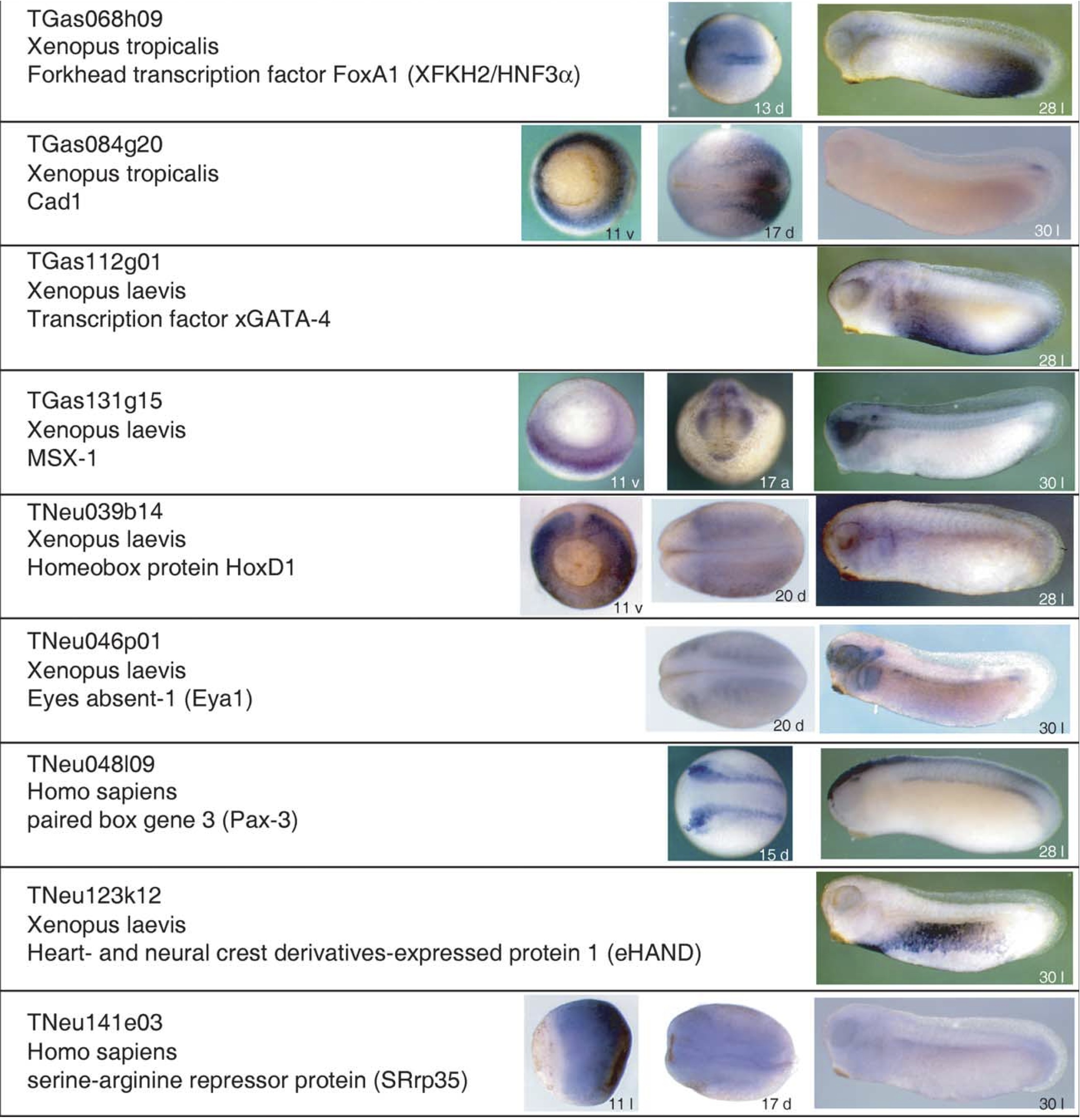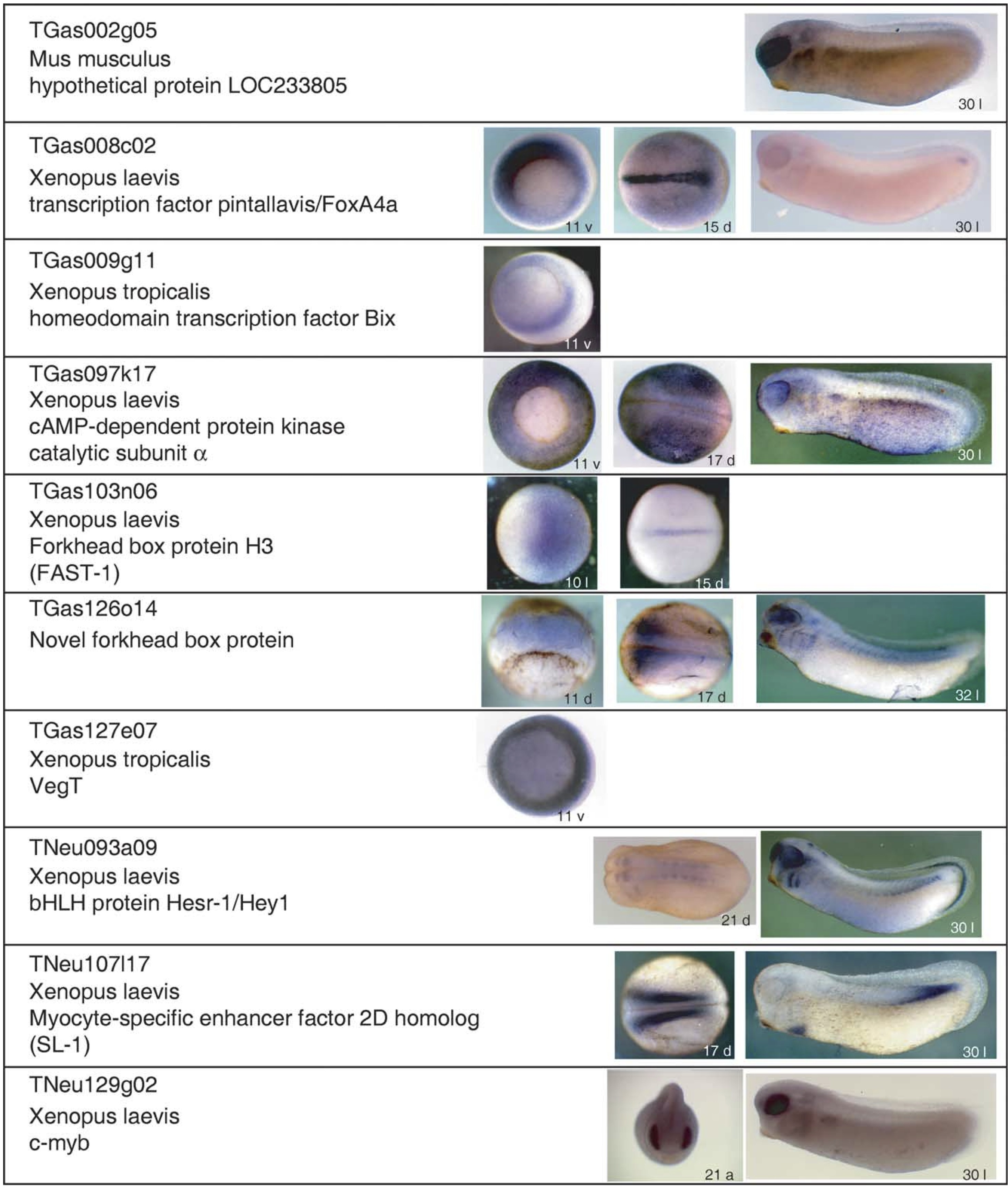 Fig. 11. Regionalized expression pattern of clones giving rise to shortened anteriorosterior axis. Seven clones from this synphenotype group gave rise to restricted expression patterns. The images are ordered by clone name. For each clone the species and annotation of the closest matching blastx hit is shown. Abbreviations are: a, anterior view (stage 17); d, dorsal view (stage 17); l, lateral view (stage 11, 28 and 30); v, vegetal view (stage 11). |