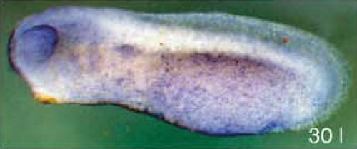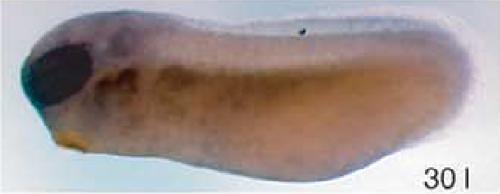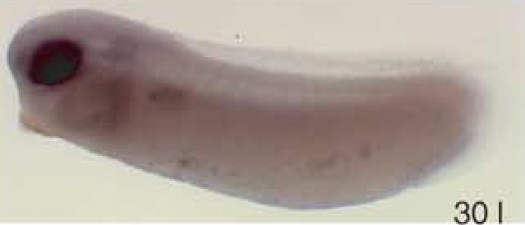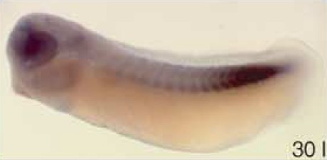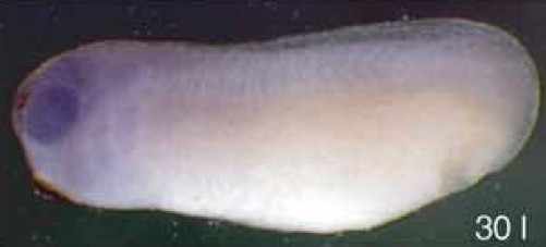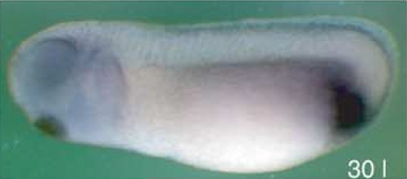 ccndx (cyclin Dx) gene expression in Xenopus tropicalis embryos, NF stage 30, as assayed by in situ hybridization. Lateral view: Anterior left, dorsal up. |