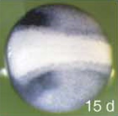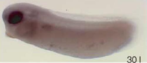 Fig. 13. Regionalized expression pattern of clones giving rise to non-mesoderm related defects. Eleven clones from non-mesoderm related defect group gave rise to restricted expression patterns. These images are sub-grouped by synphenotypes and ordered by clone name. The upper two genes (TGas058e12, TNeu023n04) gave rise to a blister phenotype; the next five genes (TGas005m21, TGas007h22, TGas108b01, TNeu058o20, TNeu104c17) gave rise to ectopic pigmentation; the next gene (TGas111k06) gave rise to apopotisis; the next two genes (TGas139k18, TNeu101f16) gave rise to a bending phenotype and the last gene (TGas100b22) gave rise to a mixed phenotype. For each clone the species and annotation of the closest matching blastx hit is shown. Abbreviations are: a, anterior view (stage 20); d, dorsal view (stage 15, 17 and 30); l, lateral view (stage 11, 21, 28 and 30); v, vegetal view (stage 11). |