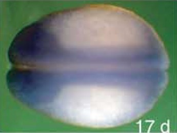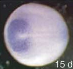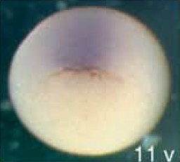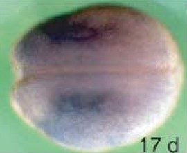 ccndx (cyclin Dx) gene expression in Xenopus tropicalis embryos, NF stage 11, as assayed by in situ hybridization. Anterior view: dorsal up. |