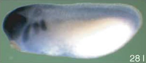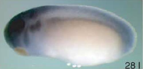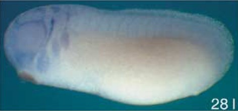 ovol2 (ovo-like 2) gene expression in Xenopus tropicalis embryos, NF stage 28, as assayed by in situ hybridization. Lateral view: anterior left, dorsal up.