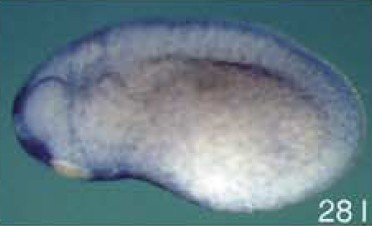 ovol2 (ovo-like 2) gene expression in Xenopus tropicalis embryos, NF stage 11, as assayed by in situ hybridization. Lateral view. |