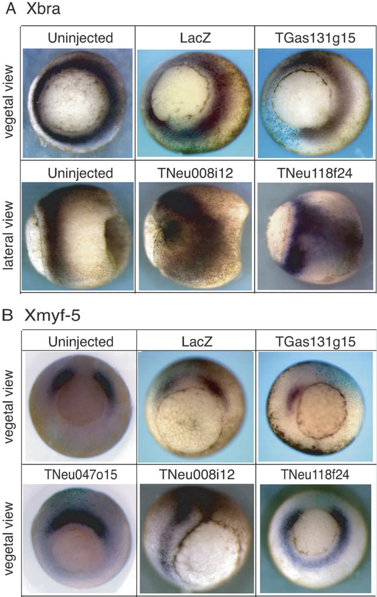 Fig. 4. Example of clones giving rise to alteration in Xbra and Xmyf-5 expression. Vegetal and lateral views of embryos at the mid-gastrula stage (stage 11) stained for the expression of Xbra (A) and Xmyf-5 (B) (purple) by whole mount in situ hybridization. Embryos were injected at two cell stage into one side of marginal zone with 400 pg of clone mRNA along with 130 pg Lac-Z mRNA. Embryos were stained with X-gal (blue). Alterations in Xbra expression included inhibition, TGas131g15 (Msx1); shift, TNeu008i12 (Tbx6); and expansion to animal pole, TNeu118f24 (Lyn tyrosine kinase). Alterations of Xmyf-5 expression included inhibition, TGas131g15 (Msx1); expansion to dorsal lip, TNeu047o15 (Ga-11 protein); shift, TNeu008i12 (Tbx6), and expansion to ventral side, TNeu118f24 (Lyn tyrosine kinase). |
