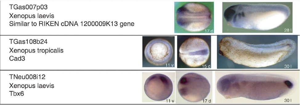 Fig. 12. Regionalized expression pattern of clones giving rise to posterior defects. Three clones from this synphenotype group gave rise to restricted expression patterns. The images are ordered by clone name. For each clone the species and annotation of the closest matching blastx hit is shown. Abbreviations are: d, dorsal view (stage 15 and 17); l, lateral view (stage 28 and 30); v, vegetal view (stage 11). |
