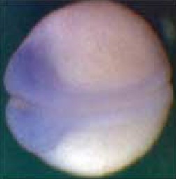 beta-galactosidase RNA as a lineage tracer (light blue staining) were injected animally into one cell of two cell stage Xenopus laevis embryo. Embryos were