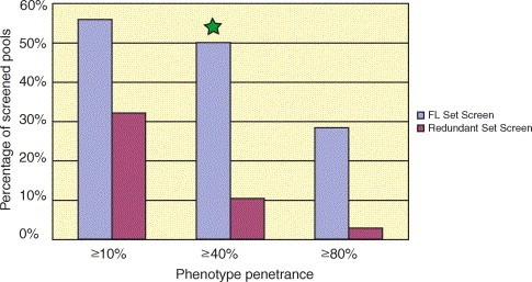 Fig. 1. Comparison of the phenotype penetrance between the redundant set and the unique full-length set screen. One hundred and six pools of a redundant neurula stage cDNA library (pool size 96 clones=10.176 cDNAs) and 120 pools of the unique full-length (FL) gastrula/neurula cDNA library (pool size eight clones=960 unique and full-length cDNAs) were screened by overexpressing â5 ng of in vitro transcribed RNA in one cell of two-cell stage embryos. Embryos were analysed at neurula and tadpole stages for changes in morphology and in the neural differentiation marker N-tubulin. Only phenotypes with a penetrance (percentage of affected embryos in a batch) of 40% or more were scored as ârealâ but analysis for lower penetrance is also shown. In the redundant set screen â10% (n=11) of the screened pools showed a phenotype (â¥40% penetrance) whereas this was raised to 50% (n=60) in the FL set screen (green star). At a higher penetrance (â¥80%) there is also a big difference in phenotype recovery between the redundant and FL set screen (3 vs. 28%). Thus the FL set screen was five-fold more sensitive in detecting gain-of-function phenotypes compared to an unmodified cDNA library. |