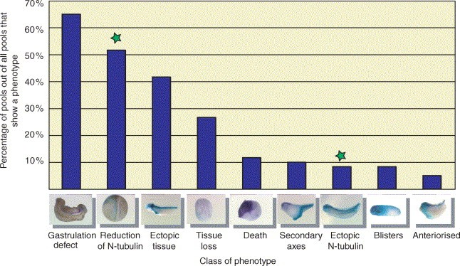 Fig. 2. Phenotypic categories found when screening the unique FL set pools. Sixty pools of the unique full-length gastrula/neurula stage cDNA library gave rise to an overexpression phenotype (at least 40% penetrance). Nine major categories (x-axis) of phenotypes, for which representative images are shown below each bar, were observed and scored. Phenotypes were classified as secondary axes (rather than ectopic tissue outgrowth) if the ectopic tissue shows axial organisation, like secondary heads (at tadpole stage) or complete secondary neural tubes (at neurula stage). Ectopic tissue outgrowth comprises tumour-like growths, protrusions (which lack clear axial structures) and other abnormal thickenings observed. Blisters are oedema-like appearances, which do not contain tissue. Phenotypes such as loss/shedding of cells and or limited cell death were grouped into tissue loss. In contrast, embryos that showed global death are classified in death. Since most of the phenotypes observed were complex, many of the pools were included in more than one category (thus the sum of the percentages is greater than 100%). Of particular interest were phenotypes that affected the neural differentiation marker N-tubulin (stars), since they might contain an activity involved in the neurogenesis pathway. (Purple staining in images: N-tubulin, light blue staining: lineage tracer LacZ). |