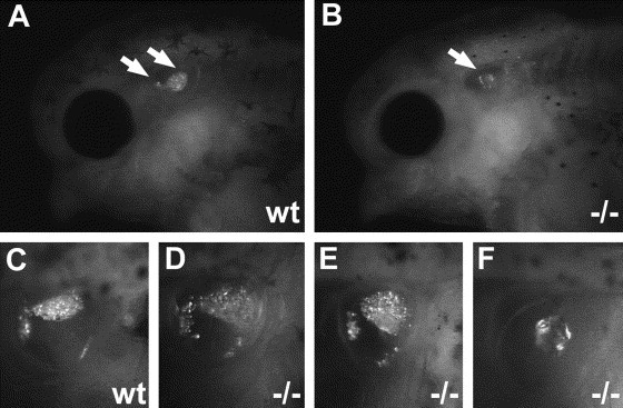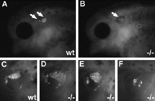 bright white structures in the wild-type otic vesicle). (C and D) The otic