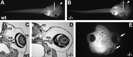 Fig. 8. Balloon Head. (A and C) Top view and cross-section through the head of a wild-type tadpole. (B and D) Similar views of a mutant Balloon Headtadpole. The arrowheads in (A) and (B) indicate regions affected in the mutant. The white line in (A) and (B) demarcate the plane of section seen in (C) and (D). (E) Arrows point to areas of edema around the eye and jaw of a Balloon Headtadpole. nt, neural tube; os, optic stalk; re, retina.