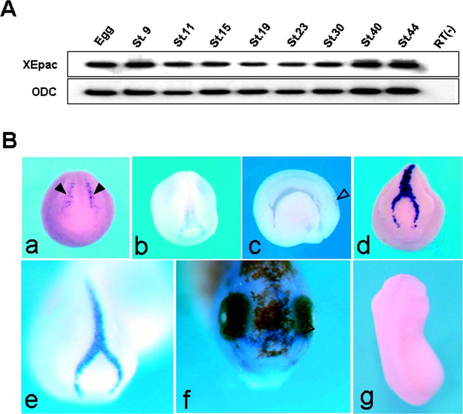 Figure 2. Temporal and spatial expression patterns of XEpac. A: Temporal expression patterns. XEpac was expressed both maternally and zygotically. RT(-), lacking reverse transcriptase. B: Spatial expression patterns. XEpac is restricted exclusively within the developing hatching gland, which forms a characteristic inverted Y type and functions as secreting hatching enzyme. It first appeared in the early neurula and persisted as long as the hatching gland existed (a-f, black and open arrowheads); no positive signals were detected with XEpac sense probe (g). a is early neurula stage; b and c are late neurula and its sagittal section, respectively; d, e, and g are tail bud stage; f is tadpole stage. c is a lateral view, g dorsal; others are anterior or dorsoanterior views.
