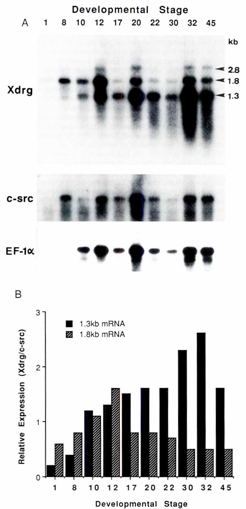 Fig. 3. Expression of Xdrg mRNA in Xenopus embryos_ (A) Northern blot analysis. Each lane contained 2-5 pg of poly A+ selected RNA Isolated from the total embryos ar the indicated stage of development. The same blot was sequentially hybridized to Xdrg. c-src and EF-1a probes. The positions and sizes of the three transcripts hybridizing to theXdrg probe are indicated by arrowheads. The signals shown here were obtained after approximately 48 h (Xdrg). 24 h (c-src) and 3 h (EF-la) exposures to the Xray films. Longer exposures (not shown here) reveal the presence of Xdrg and c-src hybridizing bands in stage 1and EF-7a band in stage 8 fanes also.