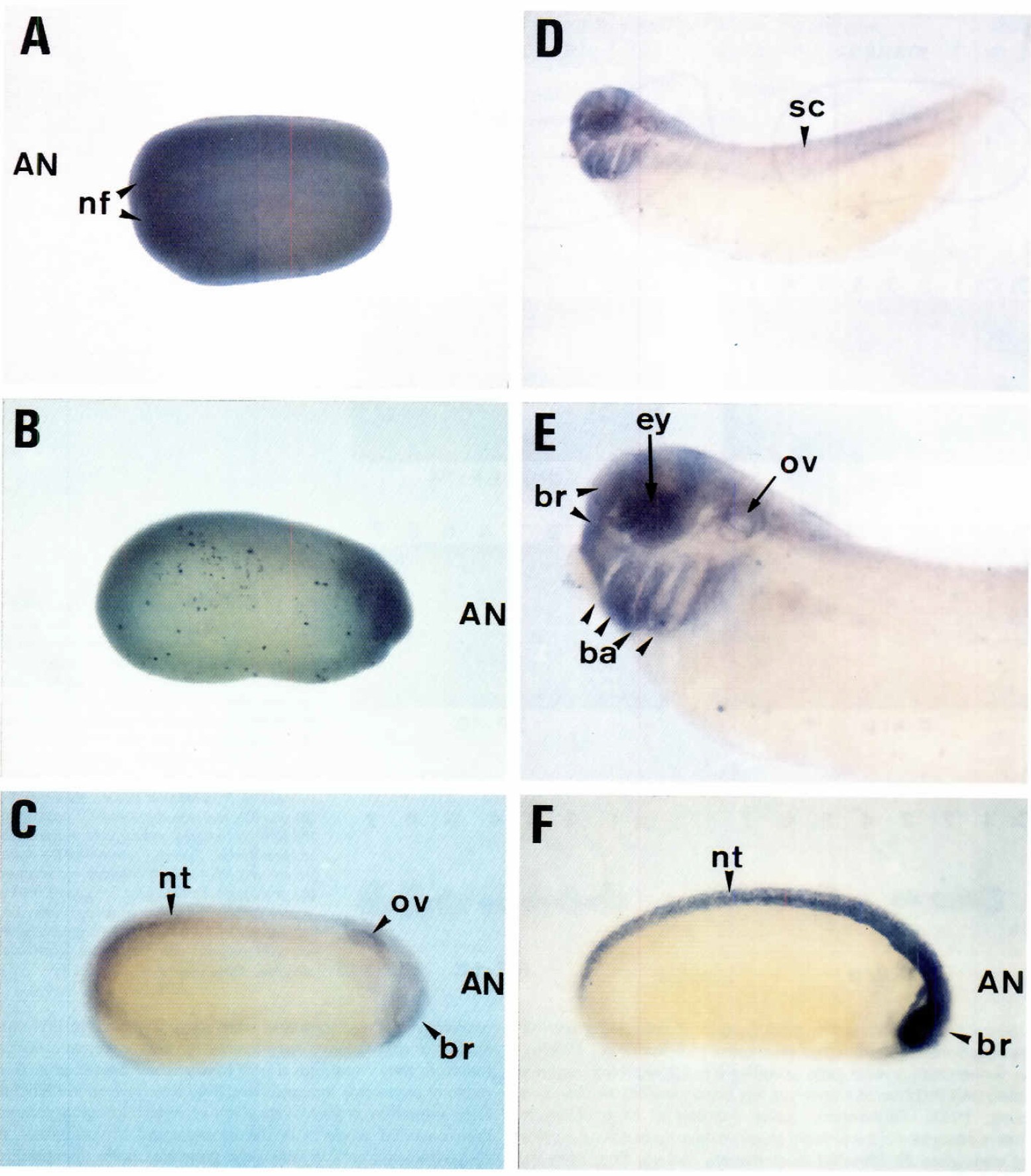 (ov) and the neural tube (ntJ. Note the strong signals In the anterior and posterior regions of the CNS. (D,E) A stage 32 embryo showing expression In