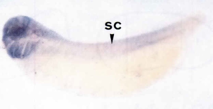 various head structures (brain. br: eye, ey; otic vesicle, ov), branchial arches-like structures (ba) and spinal cord. As a positive control, in (F), a stage 22