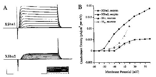 depolarized with respect to XSha 1. Calibration: 2 PA, 10 msec. B, Conductance density-voltage plots compare the voltage dependence of activation