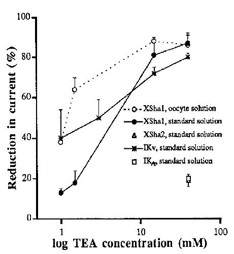 Figure 4. TEA sensitivity of XShal-induced current in oocytes. The current is efficiently blocked by TEA, in particular in the presence of