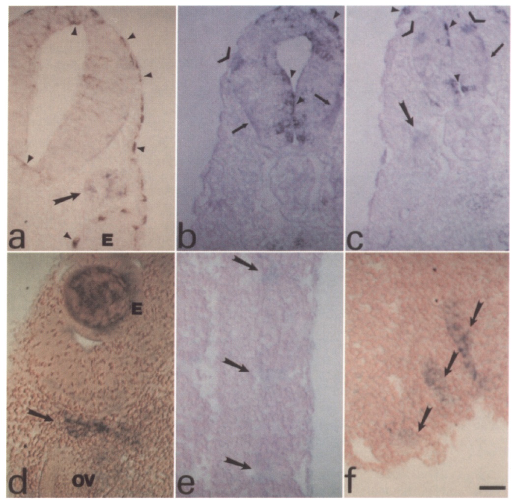 transverse section (a). e, The region surrounding the myotomal junctions has XShal staining. Anterior is toward the bott0m.f; The gill (branchial)