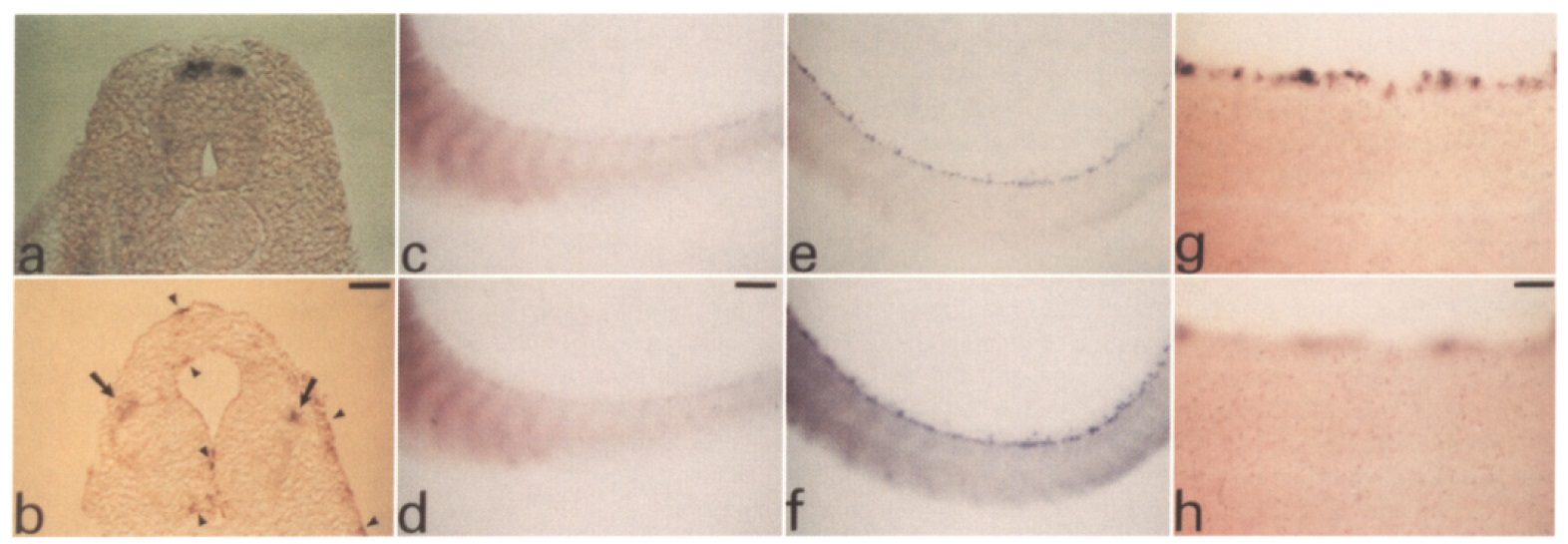 XShal signal. b, In the head, both the brain and the gill area (arrowheads) show intense staining. c, Along the length of the spinal cord, the dorsal