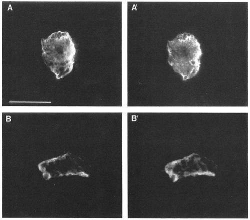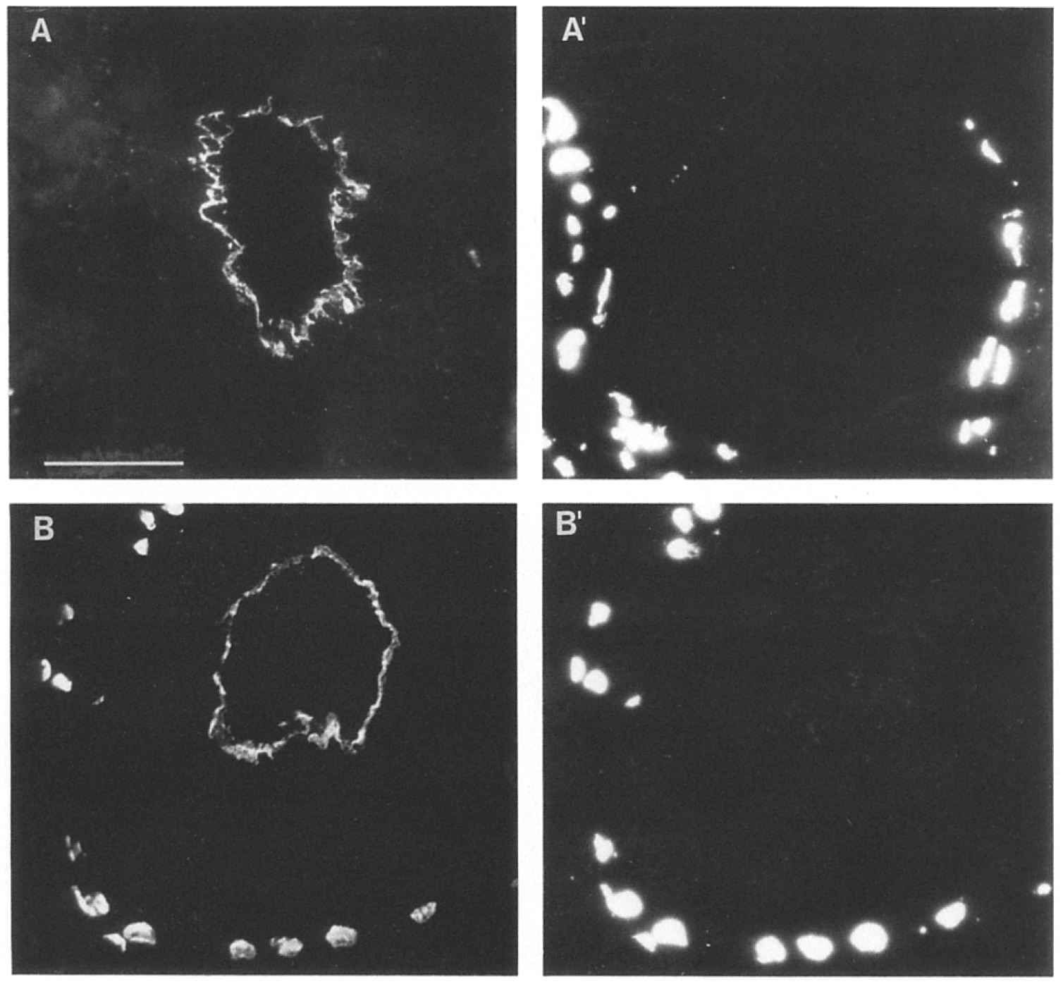 with antilamin Lm antibody 46F7 (A) or antilamin Lu antibody X223 (B). Chromatin staining (A~ B') by HOECHST. Bar, 50um.