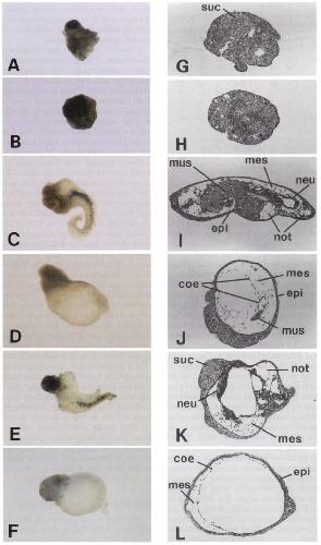 activin A. Notochord, muscle, mesenchyme, and neural tissue are formed. (D, J) Ventralblastomere explants treated with activin A. Ventral