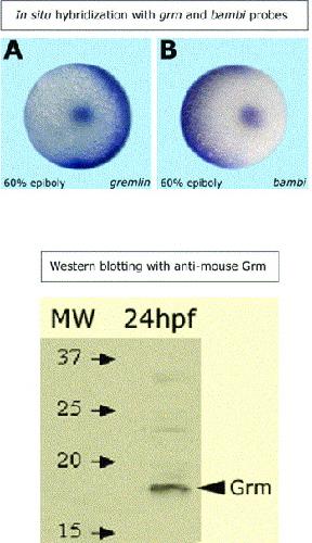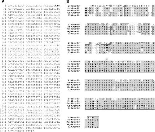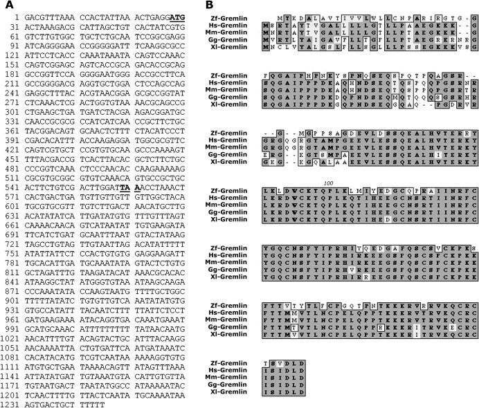 Fig. 1. Zebrafish gremlin (grm) nucleotide sequence and protein sequence comparison. (A) Full-length sequence of grm, and 5′ and 3′ UTR regions. Start and stop codons are underlined and bold. (B) Amino acidic sequence alignment of the Gremlin proteins, from zebrafish (Zf), human (Hs), mouse (Mm), chicken (Gg), and X. laevis (Xl). Residues from 96 to 170 constitute the Can domain (70–75% identity). Dark gray background indicates identical residues, light gray conservative substitutions, and white non-conservative substitutions. |