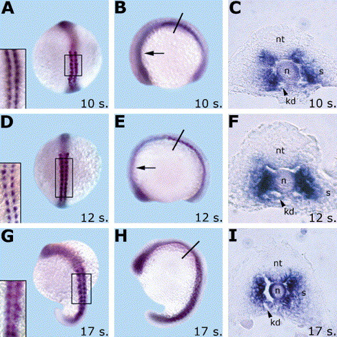 Fig. 4. grm expression pattern during somitogenesis. grm mRNA is detected at 10-somite (A–C), 12-somite (D–F), and 17-somite (G–I) stages, in whole-mounted embryos (A,B,D,E,G,H), and trunk transverse sections (C,F,I). Squares in (A,D,G) are high magnifications of the developing somites (dorsal view), arrows in (B,E) indicate grm expression in the anterior mesoderm, and arrow heads point to the forming longitudinal kidney ducts (C,F,I). Black lines in (B,E,H) indicate the cut position in the correspondent transverse sections (C,F,I). (A,D,G) are dorsal views, anterior to the top, and (B,E,H) are lateral views, anterior to the left. Abbreviations: kd, kidney ducts; n, notochord; nt, neural tube; s, somites. |