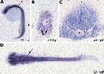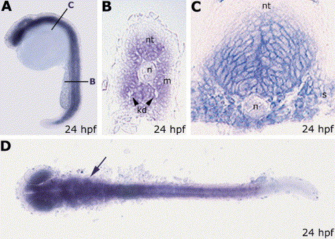 Fig. 5. Expression domain of grm at 24 hpf. Shown is a whole-mounted (A) and a flat-mounted (D) embryo, and trunk transverse sections (B,C). The arrow heads in (B) indicate the developing kidney ducts, and the arrow in (D) points to grm expression in the pectoral fin bud. Black lines in (A) indicate the cut position in the correspondent transverse sections (B,C). Embryos are oriented with anterior to the top (A) and to the left (D). (A) is a lateral and (D) a dorsal view. Abbreviations: kd, kidney ducts; m, myotome; n, notochord; nt, neural tube; s, somites. |