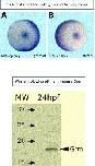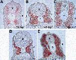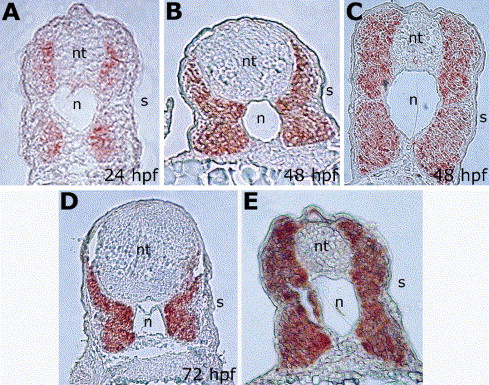 Fig. 6. Zebrafish Grm localization pattern at late stages of development. Localization of Grm protein in the developing somites as shown by immunodetection, on transverse trunk sections at 24 hph (A), 48 hpf (B,C), and 72 hpf (D,E) stages. (D) is the anterior-most section at the hindbrain level, (B) is a section of the anterior spinal cord, and (A,C,E) are posterior trunk sections. Abbreviations: n, notochord; nt, neural tube; s, somites. |