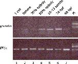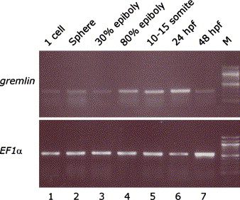 Fig. 2. grm expression during zebrafish development, shown by RT-PCR performed on RNA extracted from harvested embryos, from 1-cell to 48 hpf stages (lanes 1–7). Elongation factor 1α (EF1α) serves as a loading control. |