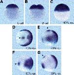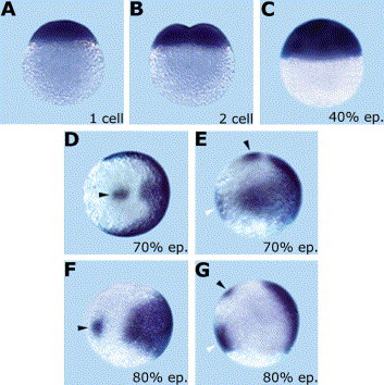 Fig. 3. grm maternal and zygotic expression during early stages of development and gastrulation. Expression pattern of grm as shown by whole-mount in situ hybridization at 1-cell (A), 2-cell (B), 40% epiboly (C), 70% epiboly (D,E), and 80% epiboly (F,G) stages. Black arrow heads point to the grm expression spot on the animal hemisphere (D–G), and white arrow heads in (E,G) indicate grm expression in the ventral mesoderm. (A–C,E,G) are lateral views, (D,F) animal views. Embryos are oriented with dorsal to the right and ventral to the left (D–G). |