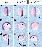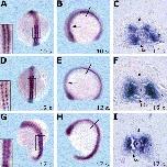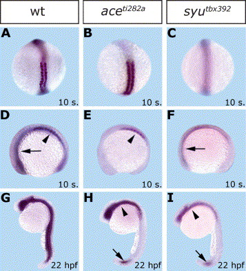 Fig. 7. Expression pattern of grm in WT, fgf8 and shh mutant embryos during somitogenesis and at 22 hpf. Shown are wild-type (A,D,G), aceti282a (B,E,H), and syutbx392 (C, F, I) embryos, stained with a grm probe. Arrows in (D,F) point to grm expression in the anterior mesoderm, and arrow heads in (D,E) to the nascent somites. In (H,I), the arrow heads indicate grm staining in the anterior mesoderm and ventral neural tube, and the arrows point to the restricted grm signal in the posterior region of the mutant embryos. Embryos are oriented with anterior to the top (A–C,G–I), or to the left (D–F). (A–C) are dorsal views, (D–I) lateral views. |