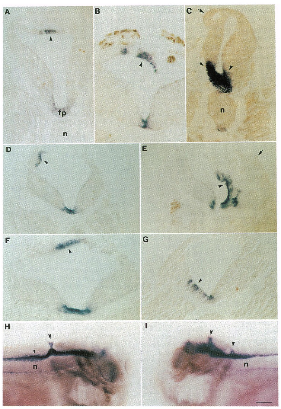 in situ labeling, showing early expression of F-spondin by small groups of cells at the ventral midline of the neural tube. (H and I) Whole-mount