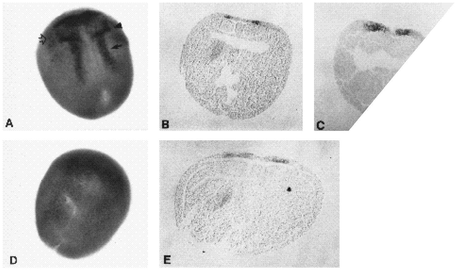 stage embryos. XASH3 (A,B,C) and N-CAM (D,E) expression in stage 14 embryos was determined by whole-mount in situ hybridization (A,D). Cross-sections of similarly staged embryos are also shown (B,C and E). Open arrow in A indicates XASH3 expression lateral to the neural plate; closed arrow indicates the mediolaterally restricted stripe revealed by crosssection in B, and the arrowhead indicates the transverse âeyebrowâ stripe revealed by cross-section in C. In A, anterior is towards 11 oâclock and, in D, it is towards 1 oâclock. Note the restricted expression of XASH3 along the mediolateral axis of the neural plate (B) in comparison to that of N-CAM (E).