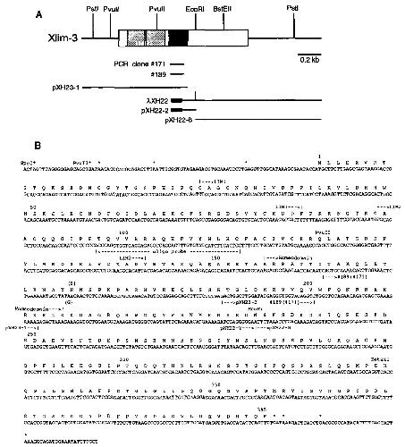 FIG. 1. eDNA clones and nucleotide sequence of Xlim-8. (A) Schematic representation of the cDNAs. Top: thin line, noncoding region; box,