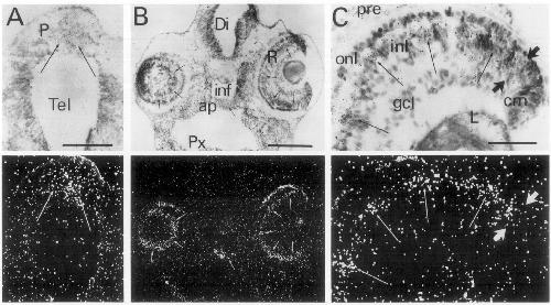 micrograph showing bilateral Xlim-3 gene expression in retina and more medially in the anteriorpituitary (ap), dorsal to pharynx (Px), ventral to the