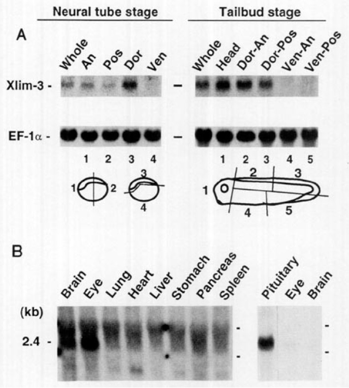 The Xenopus LIM class homeobox gene Xlim-3 was identified initially as a fragment isolated by polymerase chain reaction cloning with an embryonic cDNA library as template (Taira et al., 1992, Genes Dev. 6, 356-366). cDNA clones representing most of the Xlim-3 mRNA were isolated from an adult brain library. The predicted Xlim-3 protein contains two copies of the LIM domain, a homeodomain, and a C-terminal region rich in proline, glycine, and serine. RNA blot hybridization showed that Xlim-3 mRNA is detected in dorsal regions at neural tube and tailbud stages and in adults predominantly in the pituitary gland and weakly in the eye and brain. Whole mount in situ hybridization revealed that Xlim-3 mRNA is first detectable at the neural plate stage in the stomodeal-hypophyseal (pituitary) anlage and in the neural plate where labeled cells were found adjacent to the forming floor plate. In situ hybridization analysis on serial sections at later stages showed that embryonic Xlim-3 expression persists in the pituitary and pineal, as well as in some cells of the retina, hindbrain, and spinal cord. In the retina, Xlim-3 mRNA was only detected in a distinct sublamina of the inner nuclear layer, but not in dividing cells of ciliary margin. This discrete manner of Xlim-3 expression, especially persistent expression in the pituitary (before morphogenesis of the gland to adult), supports a role in the specification and maintenance of differentiation of distinct neuronal and neuroendocrine tissues.