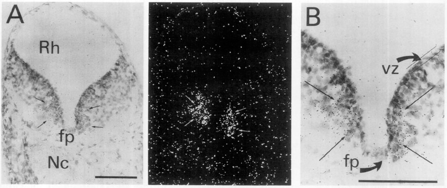found similarly in other serial sections later al to the floor plate (fp) of ventralrhombencephalon (Rh), dorsolateral to the notochord (Nc). (B)