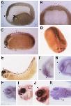 (I) stage 33/34, (J) stage 37/38, (K) stage 37/38 (dorsal view). Open triangle, hybridization to spinal cord and hindbrain solid triangle, anterior