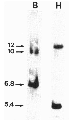 HindIII (lane H) and hybridized to a 500-bp EcoRI/EcoRI fragment