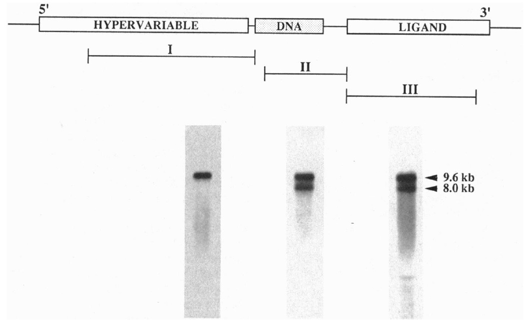 used in Northern analyses (Lower) are indicated. Probe I is a 1.1-kb cDNA fragment confined entirely to the 5' hypervariable or A/B domain
