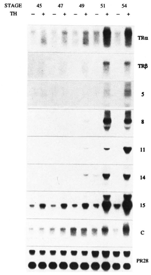 Fig. 9. Competence of tail to up-regulate TH response genes. Total RNA was isolated from tails at the indicated stages pretreated with or without1 00 nMT S (TH)fo r2 4 h. The RNA was analyzed by Northern blot.