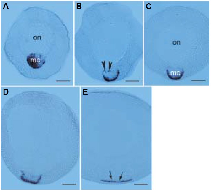 Abbreviations: mc, mitochondrial cloud; on, oocytenucleus. Bars, 50 μm.