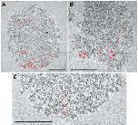 around the nucleus. (A, B) Germinal granules (red dots) are located at the