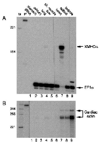 cardiac actin gene transcript (B). M, size markers (HinfI-digested