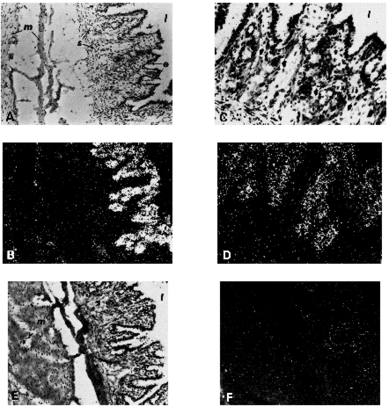 dark-field views. Indicated in A are the lumen (l), epithelium (e), submucosa (s) and smooth muscle (m). C is a higher magnification view