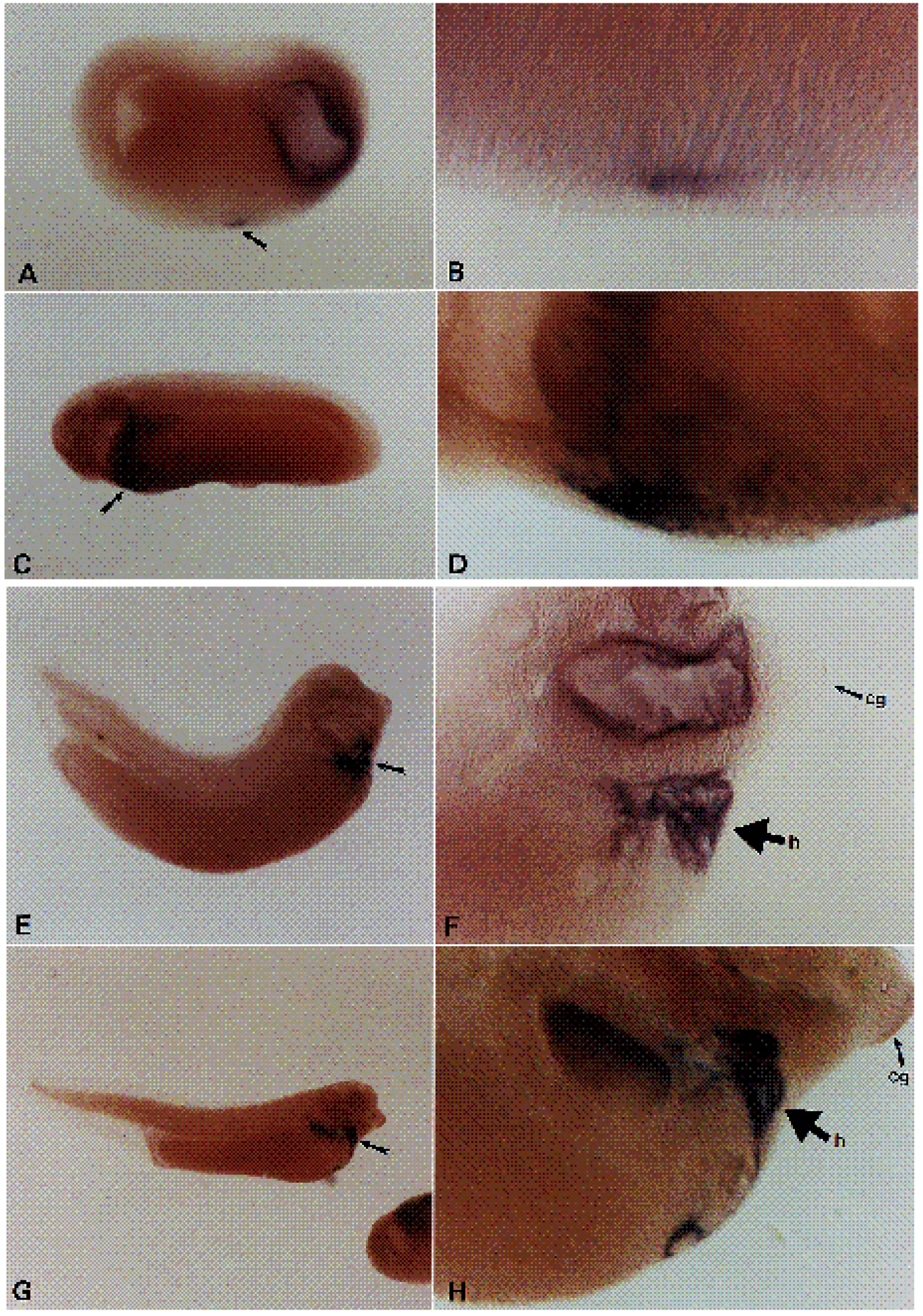 otherwise anterior is to the right. Large arrows in F and H indicate