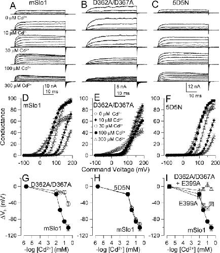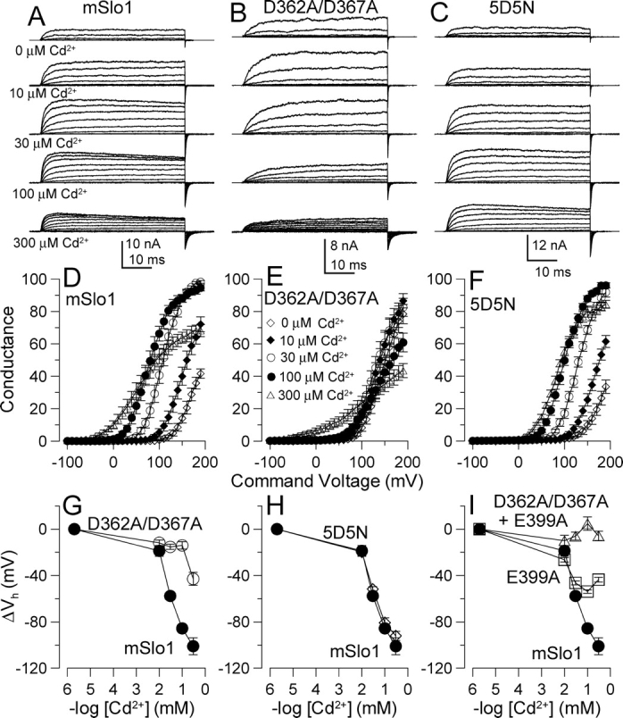 Figure 1. . Cd2+ confers high affinity regulatory effects only through the D362/D367 site. (A–C) Traces show currents from inside-out patches for Slo1 and indicated mutants with cytosolic [Cd2+]i as shown in A. Voltage steps were from −80 mV through to +160 mV in 20-mV increments following 40 ms at −180 mV, with tail currents at −120 mV. (D-F) G–V curves were generated over [Cd2+]i from 0 to 300 μM for Slo1 (n = 6), D362A/D367A (n = 7) and 5D5N (n = 6). Open diamonds, 0 μM; filled diamonds, 10 μM; open circles, 30 μM; filled circles, 100 μM; open triangles, 300 μM. Current amplitude is markedly reduced when [Cd2+]i is >300 μM (not depicted). (G) Activation ΔVh is plotted versus [Cd2+]i for wild-type Slo1 (n = 6) and for the construct with the D362A/D367A mutation (n = 7). (H) ΔVh is plotted versus [Cd2+] for Slo1 versus 5D5N (n = 6). (I) ΔVh is plotted versus [Cd2+] for Slo1 versus E399A (n = 7) and the combined mutation of D362A/D367A + E399A (n = 8). |