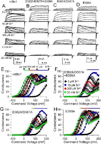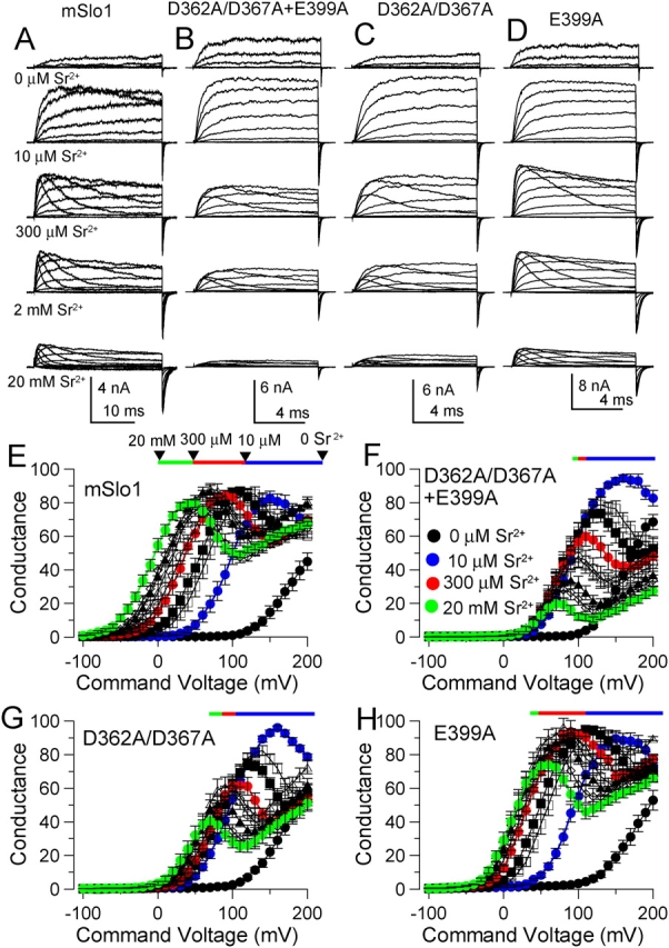 Figure 4. . Sr2+ activates BK channels through all three mutationally defined sites. (A) Current activation by Sr2+ for Slo1 is shown for voltages up to +200 mV. Note the slow voltage-dependent block at [Sr2+] of 300 μM and higher. (B) Currents activated by Sr2+ in construct D362A/D367A+E399A are shown. Note the faster time based in B–D, in comparison to A. (C) Currents activated by Sr2+ in construct D362A/D367A are shown. (D) Currents activated by Sr2+ in channels containing the E399A mutation are shown. The stimulation protocol was similar to that in Fig. 1. (E–H) G–V curves were generated over [Sr2+]i from 0 to 20 mM for wild-type Slo1(E, n = 7), the mutant with only the intact Ca2+ bowl region (D362A/D367A + E399A, F, n = 7), D362A/D367A (G, n = 7), and E399A (H, n = 5). [Sr2+]i are as follows: filled circles, 0 μM; filled blue circles, 10 μM; open squares, 50 μM; filled squares, 100 μM; filled red circles, 300 μM; open circles, 1 mM; open triangles, 2 mM; filled triangles, 5 mM; open diamonds, 10 mM; filled green circle, 20 mM. G–V amplitudes were normalized to the maximal current amplitude at 10 μM Sr2+. The colored horizontal bar indicates the approximate shift in the G–V curve for increases in Sr2+ from 0 to 10 μM (blue), 10 to 300 μM (red), 300 μM to 20 mM (green), corresponding approximately to the contribution of the Ca2+ bowl (blue), D362/D367 (red), and E399 (green) to the effect of Sr2+. |