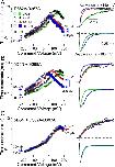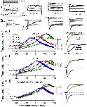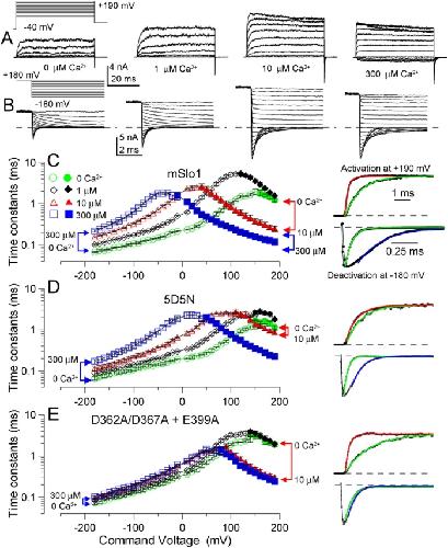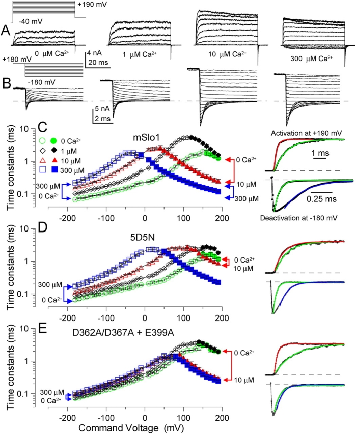 Figure 5. . The calcium bowl is mainly responsible for the acceleration of activation from 0 to 10 mM Ca2+. (A) Typical currents used for measurement of current activation time constants are shown for mSlo1 with 0, 1, 10, and 300 μM Ca2+ along with the voltage activation protocol. (B) Examples of Slo1 tail currents used for measurement of deactivation time constants are given for the indicated [Ca2+]. Voltage steps were from −180 to +180 mV in 20-mV increments (only every 40 mV is shown in the displayed protocol). (C) Activation (filled symbols) and deactivation (open symbols) time constants for Slo1 (n = 6) are plotted at various [Ca2+] showing the slower deactivation and faster activation produced by Ca2+. Traces on the right (top pair of traces) show normalized current activation at +190 mV with 0 μM Ca2+ (green line is fitted single exponential, 1.00 ms) and 10 μM Ca2+ (red fitted exponential, 0.227 ms). Bottom pair of right-hand traces show current deactivation at −180 mV for 0 μM Ca2+ (green fitted line, 0.041 ms) and 300 μM Ca2+ (blue fitted line, 0.107 ms). Both activation and deactivation examples are from the same patch. For activation time courses, only every 10th digitized current value is displayed. (D) Time constants are plotted as in C, but for 5D5N (n = 6). Traces on the right are identical in format to those in C. Activation τ: 0 Ca2+, 0.996 ms; 10 μM Ca2+, 0.771 ms. Deactivation t: 0 Ca2+, 0.041 ms; 300 μM Ca2+, 0.107 ms. (E) Time constants are plotted as in C, but for D362A/D367A + E399A (n = 8). Activation τ: 0 Ca2+, 1.61 ms; 10 μM Ca2+, 0.254 ms. Deactivation τ: 0 Ca2+, 0.074 ms; 10 μM Ca2+, 0.080 ms. |